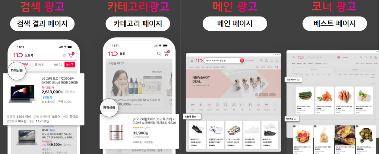 - 왜 써야 돼?: 홈 탭 '긴급 공수', 카테고리 추천딜, 배너란 배너는 다 니 차지야. "고객들이 11번가 켰는데 니 브랜드 안 보고 지나갈 수 있을 것 같아? 어림도 없지!"