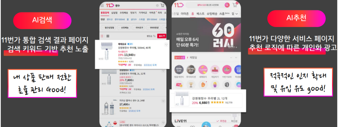 - AI 검색: PC랑 모바일 상단 꿀자리는 기본이고, 리뷰 좋은 거 찾는 깐깐한 고객들 앞에도 니 상품 가져다 바친다.